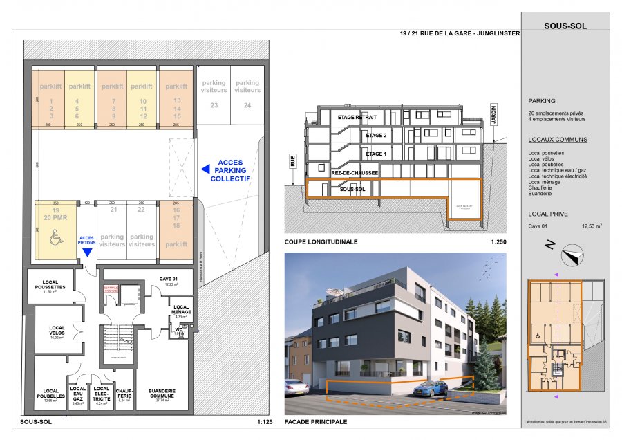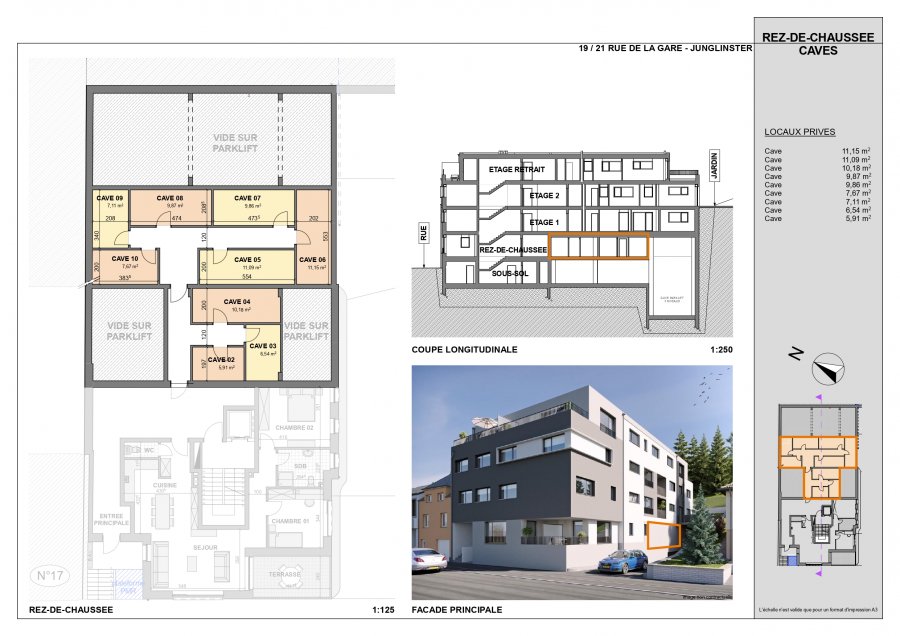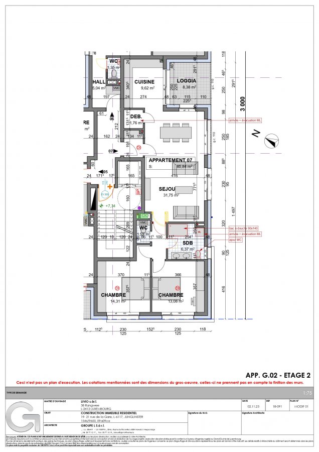 Elimte Immo vous propose un appartement G.02/07 situé à Junglinster, 19, rue de la gare, au 2ème étage, exposé SUD/EST. En construction, la livraison est prévue pour 06/2026, avec possibilité d'emménagement en 08/2026. L'appartement, d'une surface vendable de +/- 89,24 m², est composé d'un hall d'entrée, d'une cuisine (d'une valeur de 21 990 €) de +/- 9,62 m² ouverte sur un séjour/salle à manger lumineux de +/- 31,75 m², avec accès à une loggia de +/- 8,38 m², d'un débarras de +/- 1,76 m² équipé pour le branchement et l'évacuation d'une machine à laver, d'un WC séparé de +/- 1,55 m², d'une salle de douche (équipée d'un bac à douche de 90 cm x 140 cm, d'un branchement et d'une évacuation pour machine à laver, de WC, d'une double vasque et d'une fenêtre), de 2 chambres à coucher (respectivement de +/- 13,08 m² et +/- 14,31 m²), d'une cave de +/- 9,87 m² n° 7 et de 2 parklifts intérieurs n° 2 et n° 5. Pour plus de confort et d'économie d'énergie, la résidence est équipée du chauffage au sol urbain, de triple vitrage et de volets roulants électriques.Caractéristiques