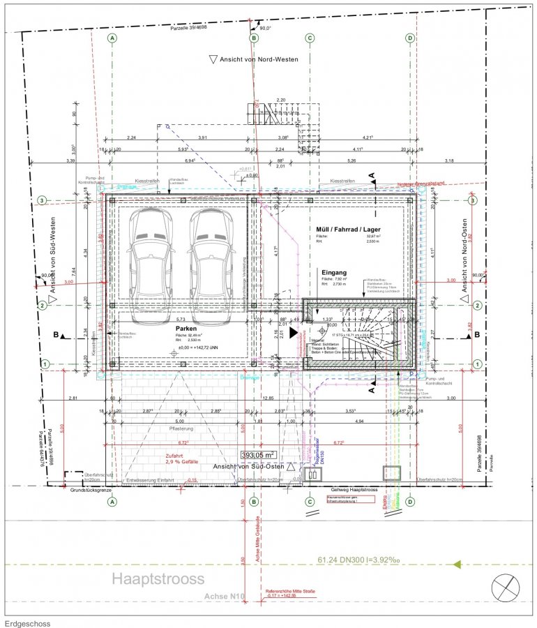 Rez-de-chaussée : 2 places de parkings extérieures, 2 places de parkings couverts et une cave, ainsi que l'entrée -/+7,92 m2
